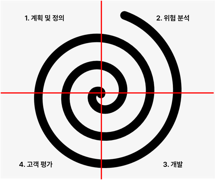 | 나선형 모델(spiral model) | 고비용의 시스템 개발이나 큰 시스템 구축 시 효과적이다. |