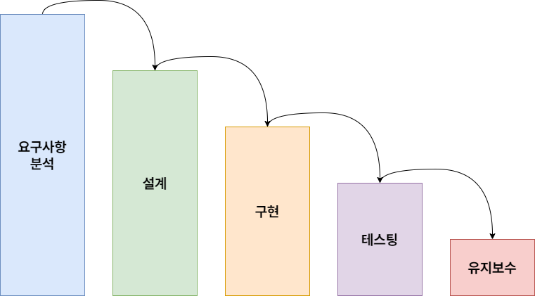 | 폭포수 모델(waterfall model) | 앞 단계가 완료될 때까지 대기 상태이다. |