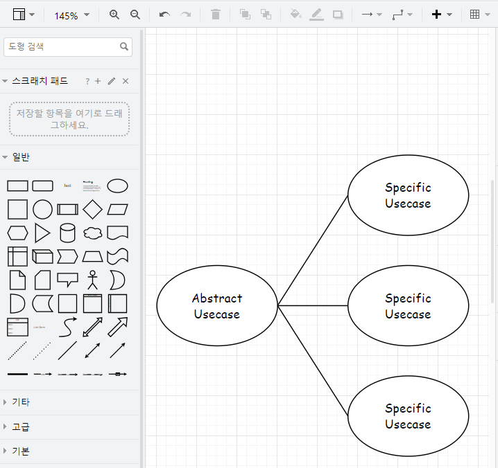 2. 구체적인 유스케이스들에서 추상적인 유스케이스 방향으로 끝부분이 삼각형의 테두리인 화살표를 실선으로 연결한다.